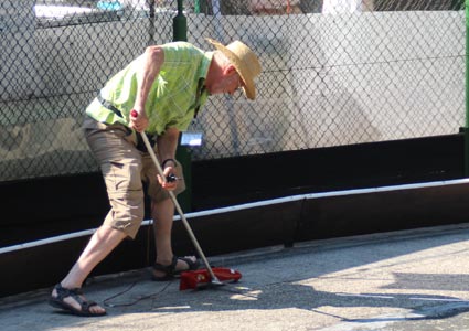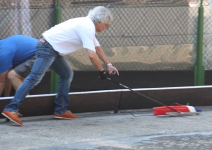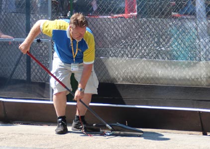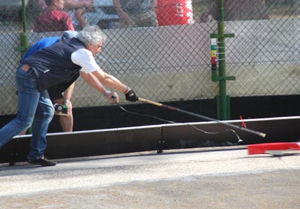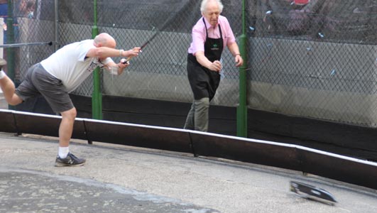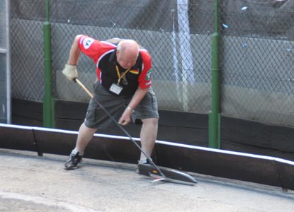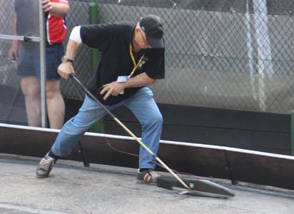 Not everyone uses a push stick as illustrated below. Some chose to push the car like a large dinky toy, either facing the direction of travel, or underarm. Here we see the varied techniques used. What has to be remembered is that the person pushing the car is not always the competitor as they might well be horsing, or in some cases, not able to get off the track too nimbly.
