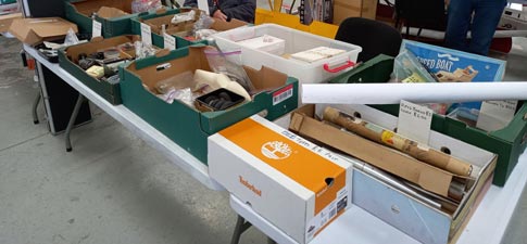 We had an informal sale at the September meeting where people could root through the boxes, which made an unbelievable amount of money, but for the swapmeet it had to be sorted, priced and arranged for sale, and what a lot there was. Just after 8.00 and everything laid out when the other traders descended en mass, although some had already reserved items the afternoon before. It was manic and way beyond our expectations until a lull prior to the public being admitted and then it went mad again. We started with a table covered in large fruit trays and ended up with a mostly empty table, so thank you to all who contributed. We were going to do it all again in April, but with so little left we will be back to the punters side of the tables next time. |