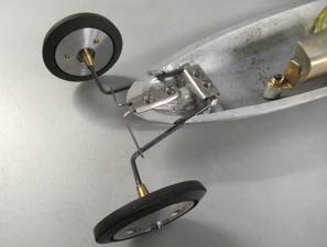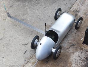 Ian Harper was one of the first runners on track with his interesting own design car with a neat hand beaten alloy body and springing all round, it is powered with a Redfin Twin shaft, the engine of choice if you can find one. It ran very well just short of 80mph with final settings being sought. Nigel Bathe ran his streamliner now fitted with a Redfin and he was also sorting final settings ready for official runs on the Saturday. I decided to try my unfinished Oliver Beginners Car (OBC) still without the body top which is yet to be made. This is designed for a single wheel drive FRV 2.5cc aero engines like Oliver Tiger or similar which are cheaper and more readily available than the twin shaft engines, genuine TS Oliver’s typically cost £500 if you can find one, replicas often now over £200 even if used? Right Ian Harper's car with titanium plate front and rear suspension |