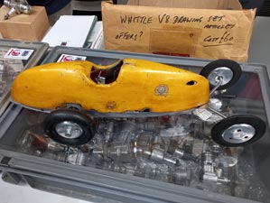 John Goodall had several tethered cars for sale on his table, but it was what appeared later in the morning that caused something of a kerfuffle. Again, we had seen it before but it had not been for sale and the owner left before we could photograph it, but here it was again, and for sale this time round. It was a 10cc car reputed to have been owned and run by Ernest Jackson of the Derby Club. A quick look inside showed marked similarities to another Jackson car discovered back in 2019 and featured in Pitbox for that year. This one had a McCoy 60 installed rather than a Dooling, connected to a McCoy gearbox, but in what looked like a one off pan with an extended front axle. Subsequent research concluded that this was yet another car of Swedish origin, both probably having been bought by Jackson when he hosted the Swedish team at the Derby Club in 1949? Then commenced the sparring, how much was it worth, how much would the owner accept, but as the posters used to say, delay is dangerous, too much discussion before it was snapped up for a very modest amount by another trader.