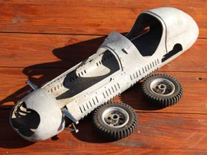 In discussions a day or two later with Hugh Blowers of OTW he thought the body could have been made initially for purely static display during 1949 similar to one of those made by Rex Hays. It has double wishbone suspension at the front, which was missing uprights and the axles and the entire rear suspension, as well as the bonnet, which was also missing. Hugh thought ZN, a firm long extinct, made the front suspension. See OTW for all the background to ZN and their products. This suspension was actually made for a tether car, as it has no swivelling axles unlike the static version, which has. The body is highly detailed with copious ventilation louvres cut into the body as per the full size car, which I had discovered was the Maserati 4CLT model originally made in 1948 only a year before the model. The car was powered by a 3 litre eight cylinder engine made up from two four cylinder 1.5 litre units joined end on, which is why there is a gap in the exhaust manifold centre. Henri Baigent had also made a very similar model to this one?