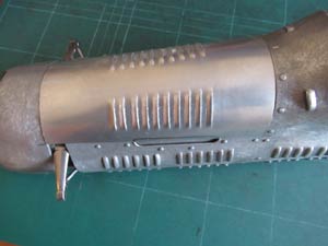 When I got home from Buckminster I looked out a set of wire wheels I had bought off Steve Betney some years previously, that were surplus to his needs. Chris Garcia in USA made these and Chris has since stopped making them but I thought they might come in useful to me one day, in spite of their high cost. That day had now arrived because they looked superb and matched closely the full size car and are runnable, so I knew I had to use them on the Maserati build. The model dates from 1949, which is why corrosion was now so evident on the 76 year old body. It comprises about sixteen different panels and doublers, which looked to have been pressed in dies all hand riveted together into a superb piece of work. I carefully rubbed the body down with fine abrasive and finished with wire wool, it did look better, but deeper pitting remained. |