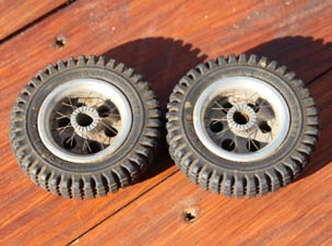 Hugh Blowers also provided me with copies of period articles on building this highly detailed model. That enabled me to make the front axles turned up in my lathe. The Chris Garcia wire wheel hubs are very small in diameter and I managed to find two ball bearings that would fit one each end of the hub giving a stable mount to the wheels when all were mounted on the axles. I turned up dummy brake drums and back plates were fabricated from two pieces of aluminium with mesh debris guards trapped between the two pieces riveted together. I added dummy hydraulic hoses made from O-ring rubber.