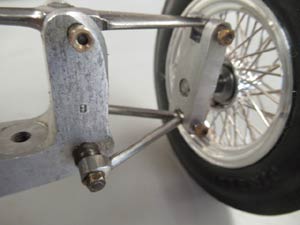 I could now concentrate on the rear suspension. I wanted this to be as close to original as possible and made up the swing arms in mild steel silver soldered to steel bushes which held the gearbox shaft housings, I added steel pockets into which the multi leaf springs ends fitted and made from Phosphor Bronze. I made up a sub frame from light gauge steel to which the swing arms would be pivoted. The centre of these pivot‘s has to be co incident with the coupling joint pivot exactly. The forward end of the springs were crimped into a bracket bolted each side to the sub frame inside the swing arms. The sub frame spreads the suspension load's widely on the fragile body. John talks about his work on the car go to www.youtube.com |