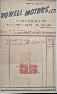 Miniature Race Car Specialists Rowell Motors, based in Dundee in Scotland, advertised themselves as one of only two British companies that produced cars and engines specifically for competition. Wilfred G Rowell gave his name to the company that marketed their products through Brian Sherriff's model shop in Victoria Road, Dundee. Wilfred George (Wilf) Rowell was a design engineer, working on industrial cranes. Along with Brian Sherriff and T Scott registered Rowell Motors as a limited company in 1949. Rowell continued working on cranes until his death in 1980. As far as is known, Rowell Motors contracted out the manufacturing of all its products and the model shop was an accommodation address and distribution point. |