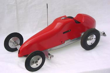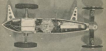 The Rapier car was quite unlike anything offered by any other manufacturer. With the exception of the gearbox and nose castings it was built from stock materials and suitable for home building. The lovely aluminium body shown here was only produced for the complete cars. Home constructed cars would have carved balsa, paper or GRP bodies. The complete car, 'built to order only' would cost £29 (in excess of £1000 today) |