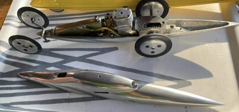 | Dooling Arrow Nothing unusual about this car, apart from its 'back story'. It was bought and run in the USA by the late Tony Higgins when he worked there. On his return to the UK he brought this, along with other cars and engines, back with him where it stayed until he sold most of them on many years later. The car is seen in an illustration from an ME article in 1978, still with its original Bruce Underwood Yellow Jacket YJ61C. having passed through the hands of a notorious dealer it was sold on to a British tethered car enthusiast, but magically, the Underwood YJ had morphed in to a very ordinary and not particularly good standard Dooling 61. The other side of the body carries decals attesting to its origins and the YJ motor and we have a pretty good idea of where the engine might have gone, but now the car is no longer original as it was in 1978. |