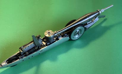 Almost certainly unique at the time, fully damped suspension with dampers mounted in a compartment under the pan. The front uses a compression damper and the rear a pull damper, now missing. The compartment is sealed with a slide in cover that involved seriously complex and accurate machining. It would be several years before damping became the norm on tethered cars.