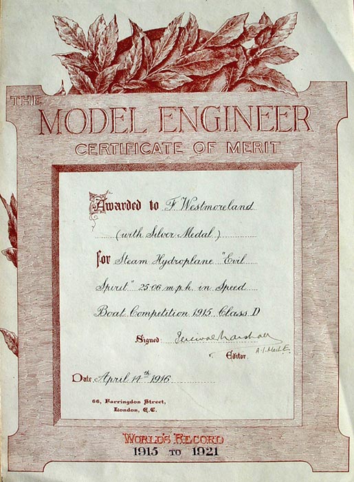 This certificate represents the ideal source material as it backs up the report of Fred Westmoreland's achievement in Model Engineer with his flash steam hydro 'Evil Spirit'. Of note is that the Speed Boat Competition continued through WW1 unlike the later conflict. The addition of the World Record caption at the bottom was a dig at the Americans who had claimed the world record in 1918 with the flash steam Elmara, but this was a spot speed and not for a measured distance. Even a source as historic as this is not quite all it seems as the date of Fred's record run was April 1916 yet he claimed the World record from 1915? 'Evil Spirit is now in the safe hands of the Northern Association to whom we have provide copies of all Fred's certificates ©copyrightOTW/individual contributors2025 |