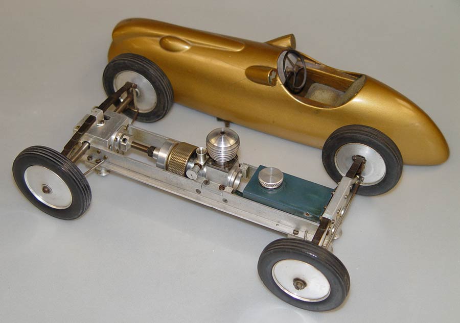 Arthur Weaver was a long standing tethered car and hydro competitor as well as a consummate engineer and model maker. In the early 1950s he turned his talents to rail racing building a number of near scale cars, powered with his own engines. Arthur was commissioned to build a series of Cooper Bristol cars for the Myers Redex company, adding one for himself to the production line. However his interest in tethered cars had waned so he built this smaller version for rail racing. The suspension has a scale appearance, dummy at the front, working at the rear. Simple and elegant construction with an enclosed gearbox. This version of his engine, unlike the more common sideport models, had a venturi that could be rotated to alter the inlet timing. Fixed rail guides (zonkers) front and rear. ©copyrightOTW/individual contributors2026 |