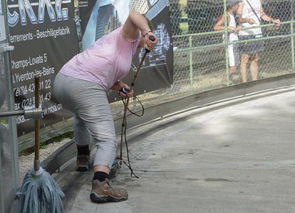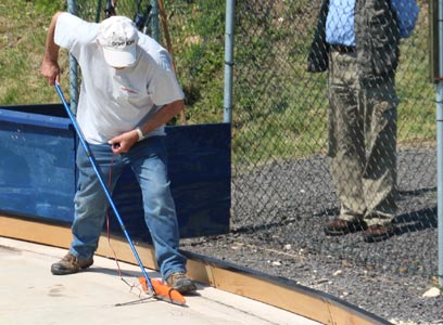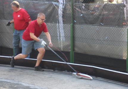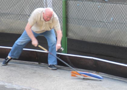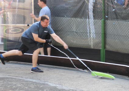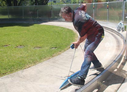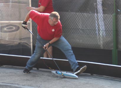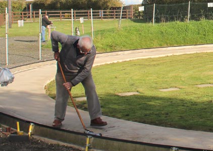 Not everyone uses a push stick as illustrated below. Some chose to push the car like a large dinky toy, either facing the direction of travel, or underarm. Here we see the varied techniques used. What has to be remembered is that the person pushing the car is not always the competitor as they might well be horsing, or in some cases, not able to get off the track too nimbly.