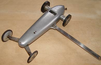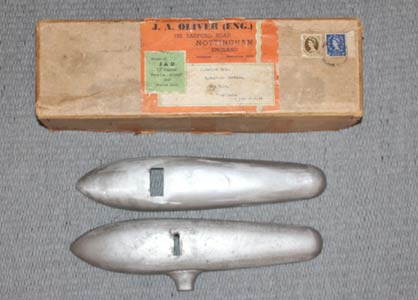 At the 1954 European Championships Oliver dominated the 1.5cc class with every entry Oliver powered. In the 2.5cc class, five of the top six were Oliver powered with one SuperTigre creeping in. Change was also afoot with the castings as the twin legged wire bridle was being abandoned in favour of the single, steel, pan handle. This required new castings with the bridle mount cast in as seen below on Ron Thrower's 'Bottom's Up' that was second at the 54EC. A change in rules also required that the new castings did not have an exhaust vent in the bottom of the pan.