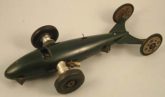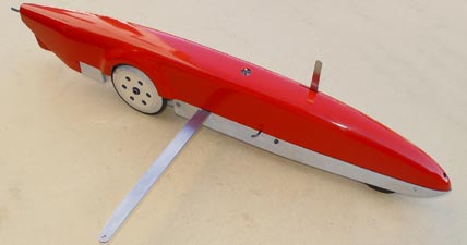 A 'frightening prospect' Gary Maslin obtained this car as a project some while ago and we featured it in August 2008. More recently it has been sold on and the build completed. What makes it unique is the use of a Nordec 10cc motor with a single drive wheel mounted directly onto the crankshaft. These motors would more normally be geared down 2:1, so with the direct drive and wooden chassis it would be a brave person who fired it up in anger. Good to see it completed though. Vendor's photo Dec 2016 |