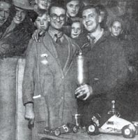 The first international meeting was held on 1st October 1949 between the UK and Sweden. A team from Sweden, led by Erik Thorpman, was invited by the MCA (Model Car Association) to compete at the Surrey Club track at a place called Christmas Pie, now sadly covered by a cul-de-sac of rather nice bungalows. A reciprocal two venue race was held in Stockholm on 21st October and Orebro on 22nd October. Right: Swedish Team L-R Harry Fjellstrom, Erik Thorpman, Harry Blomquist, kneeling Ake Johannson Below: In front of John Oliver Snr is his famous 'Busy' with Gerry Buck's McCoy 'Curly' |