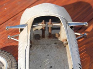 In discussions a day or two later with Hugh Blowers of OTW he thought the body could have been made initially for purely static display during 1949 similar to one of those made by Rex Hays. It has double wishbone suspension at the front, which was missing uprights and the axles and the entire rear suspension, as well as the bonnet, which was also missing. Hugh thought ZN, a firm long extinct, made the front suspension. See OTW for all the background to ZN and their products. This suspension was actually made for a tether car, as it has no swivelling axles unlike the static version, which has. The body is highly detailed with copious ventilation louvres cut into the body as per the full size car, which I had discovered was the Maserati 4CLT model originally made in 1948 only a year before the model. The car was powered by a 3 litre eight cylinder engine made up from two four cylinder 1.5 litre units joined end on, which is why there is a gap in the exhaust manifold centre. Henri Baigent had also made a very similar model to this one?