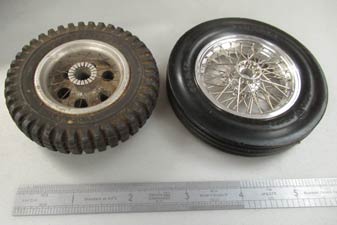When I got home from Buckminster I looked out a set of wire wheels I had bought off Steve Betney some years previously, that were surplus to his needs. Chris Garcia in USA made these and Chris has since stopped making them but I thought they might come in useful to me one day, in spite of their high cost. That day had now arrived because they looked superb and matched closely the full size car and are runnable, so I knew I had to use them on the Maserati build. The model dates from 1949, which is why corrosion was now so evident on the 76 year old body. It comprises about sixteen different panels and doublers, which looked to have been pressed in dies all hand riveted together into a superb piece of work. I carefully rubbed the body down with fine abrasive and finished with wire wool, it did look better, but deeper pitting remained. |