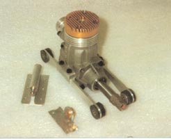 The engine is a two-stroke glow plug motor designed for a very high performance using 80% methanol and 20% castor oil fuel. Extensive work has been carried out on the basic commercial motor (OPS) with little of the original motor remaining either in use or un-modified. The piston and liner unit comprises of a chromed brass liner and aluminium piston. The liner for this particular engine was made in Moscow and the piston made by the builder from high silicon aluminium alloy. The separate combustion chamber cylinder head is homemade from brass not aluminium as is more usual. Eight bolts have been incorporated in the cylinder head clamp ring to eliminate possible distortion from the original four-bolt system. |