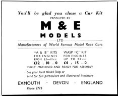 M&E introduced their tethered cars at the Model Engineer exhibition in 1947. A feature of the hall was a circular tank for boats with a track for aircraft, and tethered cars round it. The Chief Engineer of M&E (Mr Thornton) demonstrated their cars on the track throughout the exhibition and shown here is the Special bodied version going through its paces at 40mph. A correspondent in Model Engineer chided Mr Thornton because his white workshop coat was dirty and showed 'lack of professional standards'.