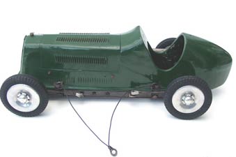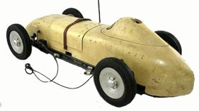 In 1947, following a year of intensive development, the company introduced a 'range' of tethered racing cars. These cars were all based on the same chassis from steel rails with folded steel cross members, engine mounts and mounts for coils, condenser and batteries. Wheels carried scale Dunlop Fort or Cressite tyres with suspension for the front axle/gearbox unit and the steerable rear axles. A very solid clutch and flywheel unit was included along with a semi circular fuel tank and ignition 'knock off' switch. Impressive scale and semi scale, hand carved, softwood bodies completed the models and were the only real difference between the models in the range. Parts were available individually or as sets.