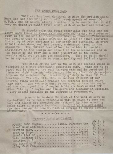 It is the final two pages that solve the mystery of why only two Rapier cars have ever turned up and no complete Sabre cars. Although the Rapier was originally advertised as a complete car, it would be 'built to order only', the hand beaten body and tail piece made it far too expensive, and the market for 10cc cars was already moving towards the out and out race car format. The 1951 price list shows that the basic parts were still available but no complete cars. Enter the Sabre around late 1949/1950. An example of this was used as illustrations in 1950 for an article by Wilf Rowell in Model Engineer on ignitions systems the car showing marked similarities to the Dooling Arrow (the Rowell wheels were an almost exact copy in any case). The car pictured also had a hand beaten, aluminium body, but unlike the Rapier, neither it or any others have never been seen or come on to the market, although period results and photos show them being run, including one by Gerry Buck. A pan did turn up several years ago, which was rebuilt copying the photos in ME, but was always viewed as a 'replica'. The second page changes all that as it clearly states that the Sabre alloy pan would be 'supplied in a cast, unmachined condition only'. Everything else was left to the builder, all the machining, supplying the components and building a body. No drawings would be provided 'as its construction is obvious to anyone looking at the pan'. The implication was that if you were undertaking such a project, you would know what you were doing and could work everything out. The pan is very similar to a Dooling except the sides are parallel around the engine mount area and there is a distinct angle towards the front, rather than the smooth curve of the Arrow, an easy way to distinguish them apart if one ever turned up. It also means that the Sabre shown below is no less original than any other as they all started from the same, bare pan.