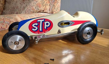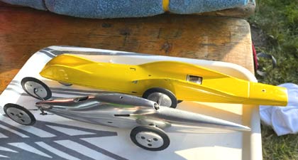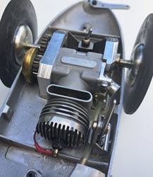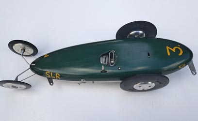 Jan Erik Falk's long and distinguished tethered car racing career began in the very early 1950s with his first European Championship meeting in 1956. He won his maiden championship in 1962 and has continued to add World and European Championships regularly from then on to the present day, his most recent being this season. Two early cars here, a typical Swedish twinshaft with a home built engine and an extremely close fitting and streamlined body. The bevel drive car is another gem with a streamlined, hand beaten body, the likes of which we just don't see from the same period in the UK. |