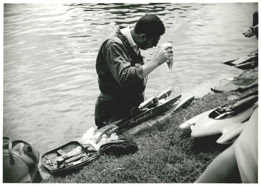 The MPBA used to hold two prestigious regattas each season, the Grand and the International, which as the name suggests hosted enthusiasts from other countries from the 1920s right through to 2008. The visitors were primarily French from the three active clubs over there although there were visitors from Australia and the USA running boats. Above is one of the regulars in the late 50s and into the 60s, Jean Menant with Spido 8 and its very extended skeg. Also in the photo is Stan Clifford's GRP Polyester. Sadly, pollution of Verulamium Lake brought an end to the 'International' with the last running at St Albans in 2013. The name does live on but as a stand alone event at Kingsbury. ©copyrightOTW/individual contributors2026 |