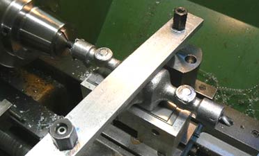 The start of the gearbox front mounts, one for each side. The second picture shows truing up the set up ready for machining the pivot boss. I spot drilled the centre of the boss in the milling machine. There is a bar between the spot drilling and a centre in the tail stock, the bar wobbles until it is true. Picture three, one of the finished gearbox mounts. And finally the axle for the gearbox getting it to size to fit the bearings. I don’t have a grinder to do this but a piece of emery on a parallel or other flat piece of steel works well using the bearing as a gauge.