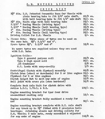 Zere reappears in 1946, solidly allied to the newly established sport of tethered car racing and the first of the ZN products that established his name and reputation, the ZN Semi-Pneumatic wheel and tyre. This was so far in advance of any other product available that innumerable competitors and record breakers used them for the next ten years. A screwed collar held two accurately machined aluminium halves together, with a rubber seal between them, sandwiching a hollow tyre in the process. The tyre could be inflated with a cycle pump through a simple, rubber sealed valve, using a special adapter supplied by ZN. The vital element was an aluminium ring that fitted within the tyre to stop it 'flinging' off the wheel. So revolutionary was the design that Zere applied for worldwide patents for these wheels in 1946. That and subsequent patent applications can still be viewed online. However, despite the patent, it transpires that other and larger manufacturers bypassed these and started producing their own ‘tubeless’ tyres’. Larger and smaller versions of these tyres soon followed along with solid, knife edged, front tyres with hubs of the same style but without the seals. The great advantage of the ZN wheels and tyres was that they could deal with the very highest of speeds that the cars of the period were reaching and remarkably, many of the seventy plus year old tyres are still quite useable.